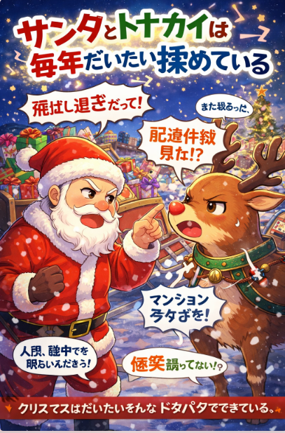 「クリスマス」「サンタとトナカイのケンカ」「爆笑コメディ」「クリスマスあるあるをさりげなく入れて」「軽快かつコミカルな作風に」「文字数はお任せ」